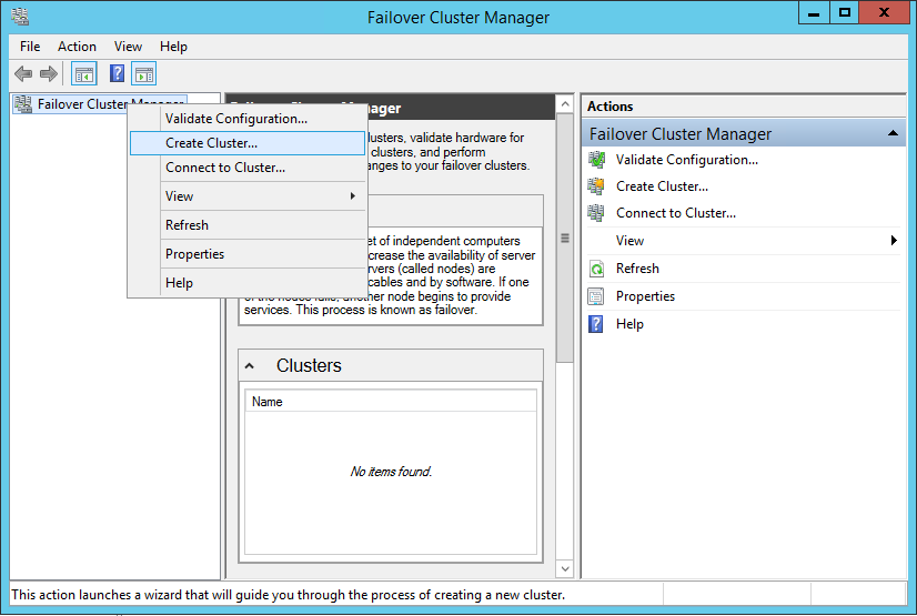 Select Failover Cluster Manager and select the Option Create Cluster OR You can right-click on the Failover Cluster Manager and select Create Cluster menu.