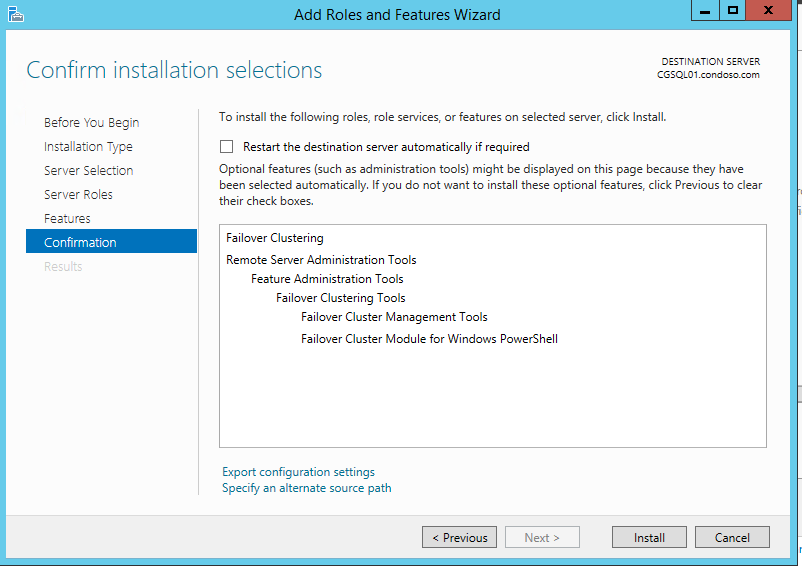 Click Install to install the Failover Clustering feature.